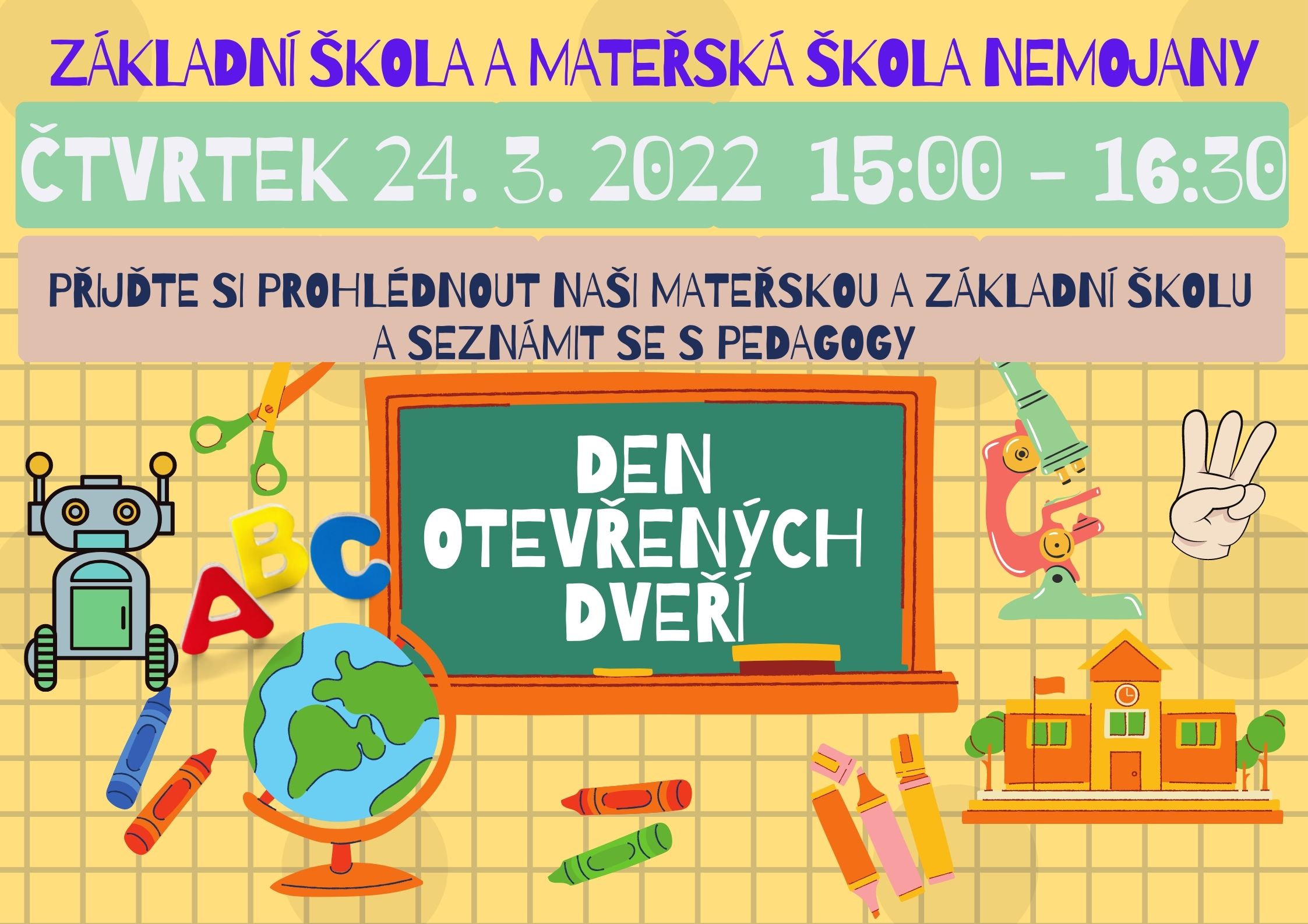 ZŠ MŠ Nemojany pořádá ve čtvrtek 24. března 2022, 15 - 16:30 hod. Den otevřených dveří.