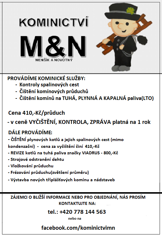 Firma českomoravské kominictví Menšík a Novotný bude v naší obci dne 11.10.2022 provádět kontroly a čištění komínů, spalinových cest, čištění spalinových cest u plynových kotlů a revize kotlů na tuhá paliva.. Cena za čištění a kontrolu i se zprávou o provedení kontrol a čištění činí 410,-Kč.