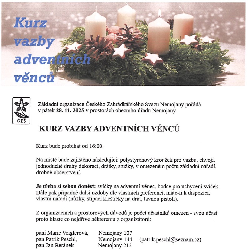 Základní organizace Českého Zahrádkářského Svazu Nemojany pořádá v pátek 28.11.2025 od 16:00hod. v prostorách obecního úřadu Nemojany kurz vazby adventních věnců. S sebou si prosím doneste svíčky na adventní věnec, bodce pro uchycení svíček, případně ozdoby dle vlastním představ.