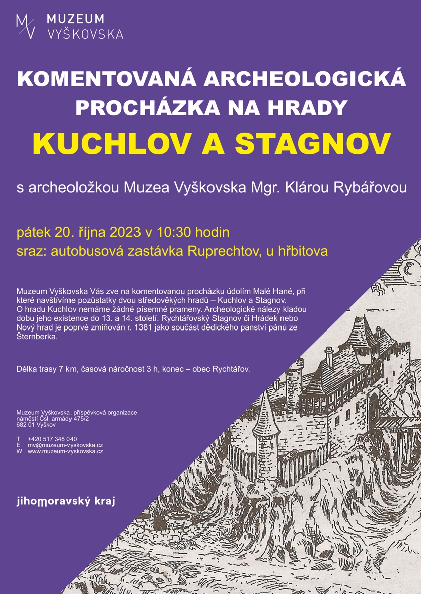 Muzeum Vyškovska Vás zve na komentovanou procházku údolím Malé Hané, při které navštívíme pozůstatky dvou středověkých hradů – Kuchlov a Stagnov. O hradu Kuchlov nemáme žádné písemné prameny. Archeologické nálezy kladou dobu jeho existence do 13. a 14. století. Rychtářovský Stagnov či Hrádek nebo Nový hrad je poprvé zmiňován r. 1381 jako součást dědického panství pánů ze Šternberka. Časová náročnost akce je 3 hodiny.