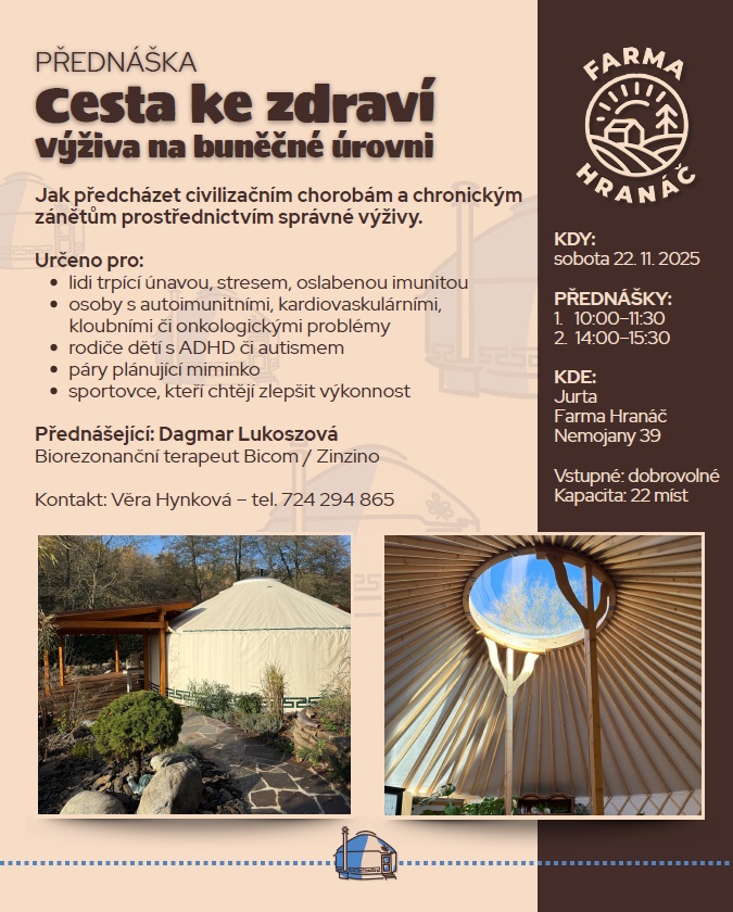 Farma Hranáč v Nemojanech v sobotu dne 22.11.2025 zve na přednášku o Cestě ke zdraví v JURTĚ na Hranáči.