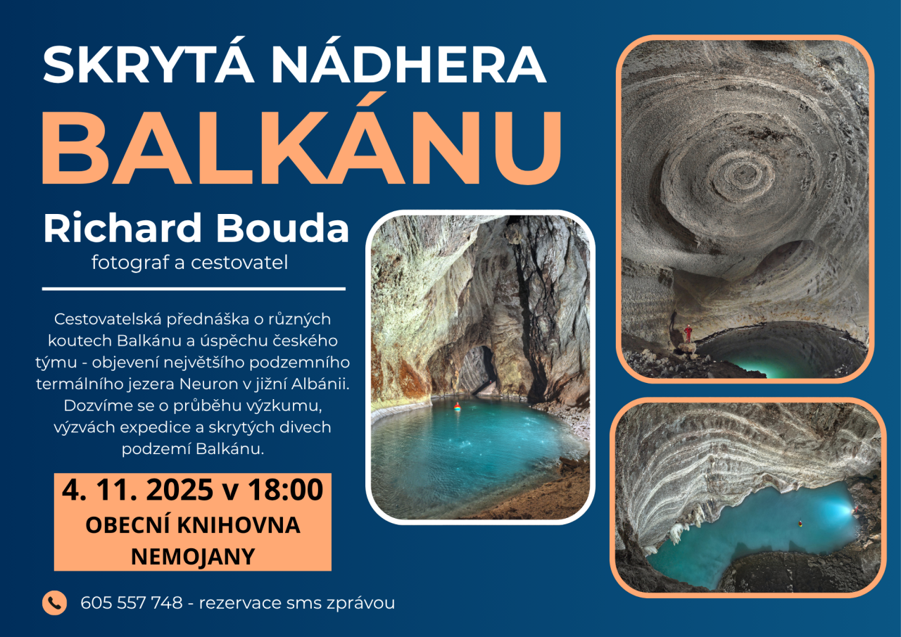 Obecní knihovna Nemojany zve všechny občany na cestovatelskou přednášku o různých koutech Balkánu a úspěchu českého týmu -objevení největšího podzemního termálního jezera Neuron v jižní Albánii, která se koná v úterý dne 04.11.2025 v 18 hod. v Obecní knihovně.