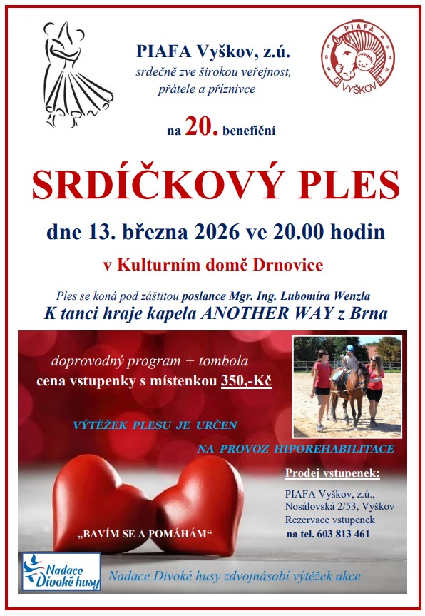 Srdečně Vás zveme na 20. benefiční Srdíčkový ples, který se uskuteční v pátek 13. března 2026 od 20:00 v Kulturním domě v Drnovicích. Čeká Vás slavnostní večer plný hudby, tance a příjemné atmosféry, během něhož společně podpoříme dobrou věc. Přijďte s námi oslavit výjimečný jubilejní ročník, užít si krásný večer a dát svému srdci prostor rozdávat radost. Budeme se na Vás těšit.