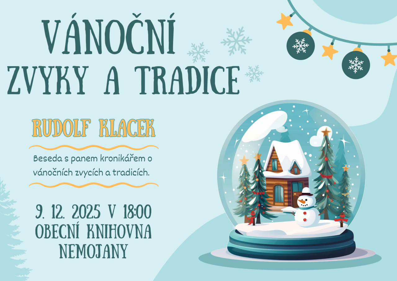 Obecní knihovna Nemojany dne 09.12.2025 v 18 hod. zve všechny občany na besedu s panem kronikářem o vánočních zvycích a tradicích.
