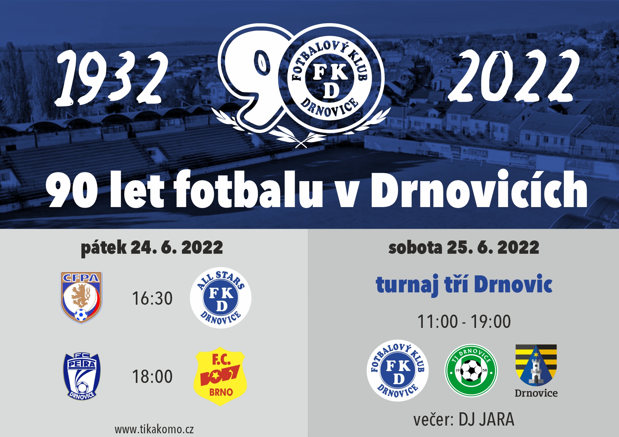 Páteční odpoledne bude v nedalekých Drnovicích patřit fotbalu. V rámci oslav 90 let založení fotbalu v Drnovicích se na drnovickém stadionu uskuteční v pátek 24.6. od 18:00 zápas bývalých hráčů FC PETRA Drnovice a FC BOBY Brno. Můžete se těšit, že na trávníku opět uvidíte hráče jako Drulák, Kafka, Weber, Timko, Holeňák, Majoroš na straně jedné nebo Dostálek, Švancara, Došek, Trousil, Siegl na straně druhé.
