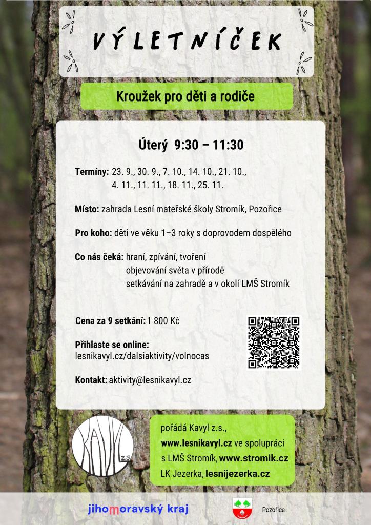 „Máte doma malé dítě a chcete s ním zažít společné dopoledne, tvoření a hry venku? Přijďte do kroužku Výletníček, který začíná v úterý 23.09.2025 v 09:30hod. v Lesní mateřské škole Stromík v Pozořicích na Jezerách.
