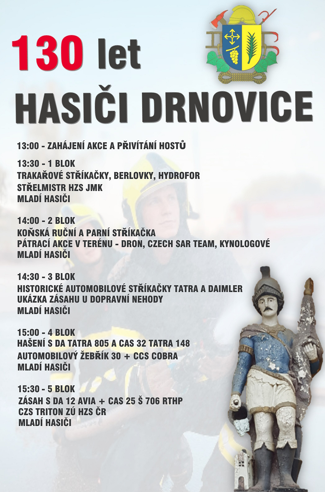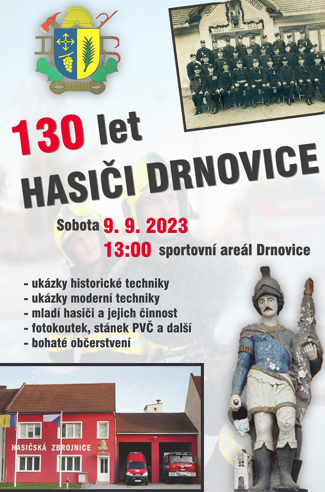 Sbor dobrovolných hasičů Drnovice vás zve v sobotu 09.09.2023 od 13:00 hod. na oslavy výročí 130 let od založení sboru. Akce proběhne ve sportovním areálu u hasičského cvičiště (vedle tenisové haly). Těšit se můžete na statické a dynamické ukázky techniky historické i té nejmodernější. Pro návštěvníky bude zajištěno občerstvení.